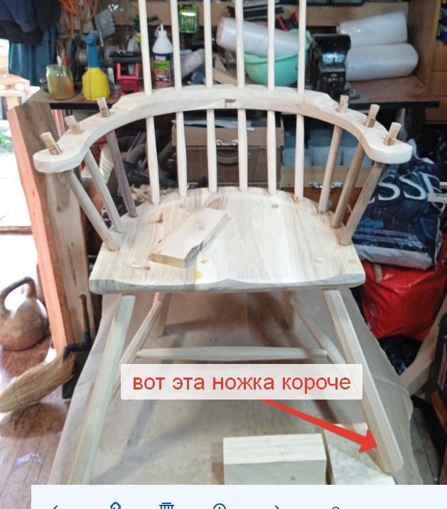 Вчера приехал после фестиваля столярного дела и, вдохновленный, сразу же взялся за свой проект SIX STICK COMB BACK. Нужно было подрезать ножки в уровень. Заготовки для ножек у меня были разной длинны, причем одна сильно короче остальных. Вот тут видно хорошо: Пришлось от нее отталкиваться. В результате визуально кресло выглядит низким. У меня вышло 16,5 дюймов. Но Шварц пишет что высота у его кресел от 15,5 до 17,5дюймов (это если для людей обычного роста, а не баскетболистов), причем чем ниже, тем удобнее. И действительно, сидеть в нем очень удобно, вставать не хочется. Осталось всего ничего - тест на шаловливые ручки и окончательная отделка. Переведу Вам отрывок из книги Шварца о высоте кресел: "ВЫСОТА СИДЕНЬЯ