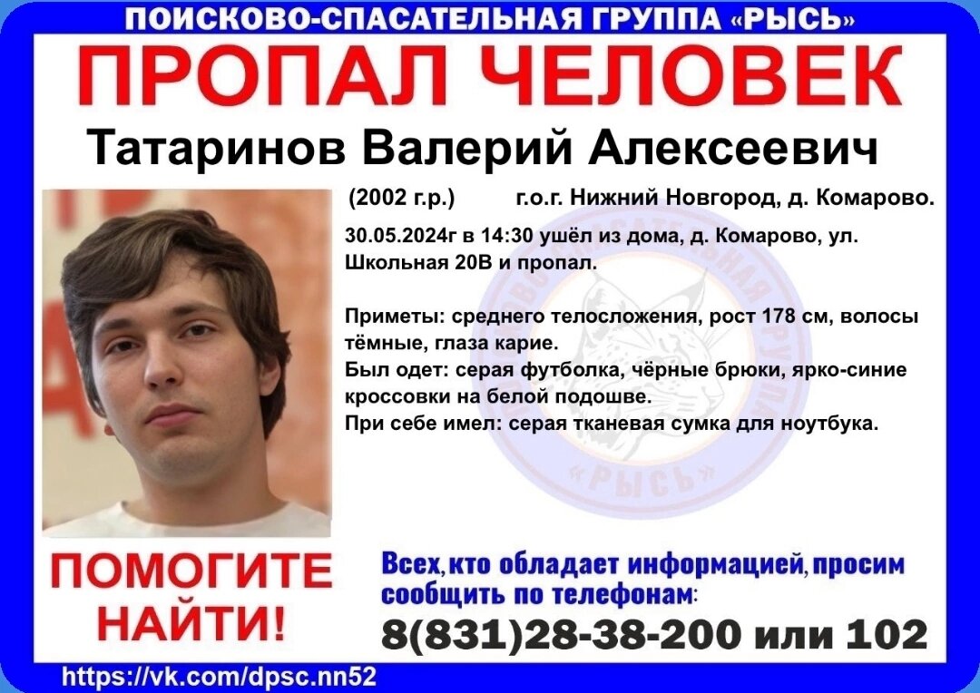 ⚡️Разыскивается Татаринов Валерий Алексеевич, 2002 года рождения, проживающий в деревне Комарово Нижнего Новгорода. 30 мая 2024 года Валерий Татаринов ушел из дома и до настоящего времени его местонахождение неизвестно, сообщают в ГУ МВД по Нижегородской области. ❗️Приметы разыскиваемого: телосложение среднее, волосы удлиненные темно-русые, глаза карие, рост 186 см. На момент исчезновения молодой человек был одет в серую футболку, черные джинсы, ярко-синие кроссовки. С собой у него была серая тканевая сумка для ноутбука. 📱Сотрудники полиции просят граждан, которым что-либо известно о месте нахождения разыскиваемого, обстоятельствах его исчезновения, сообщить по каналу связи 02 (102 - с мобильного телефона). P. S. Особенно нижегородцы, поделитесь публикацией, присмотритесь, вдруг кто-то видел или что-то знает. Близкие очень ждут и волнуются!