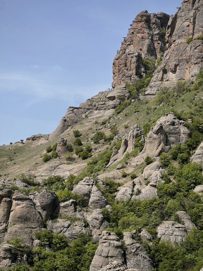 Долина привидений, раскинувшаяся на 20 гектарах склонов горы Демерджи, представляет собой загадочное место с необычными скальными образованиями. Эти скалы, выветренные и отполированные ветром, высокие и изменчивые, создают эффект меняющихся форм при различных условиях освещения и углов зрения. Многие скалы имеют характерные названия, отражающие их внешний вид: Великан, Хозяин долины, голова Екатерины, Орел, Горилла, Три гнома, Чертов палец и Каменные столбы, иногда называемые Каменными фаллосами. Именно тут снимали некоторые кадры из фильма - Кавказская пленница. Тропа начинается в поселке Лучистое, от конного клуба «Золотая Подкова». Крым, апрель 2024. Пост автора Gefesttravel. Комментарии к посту на сайте Пикабу.