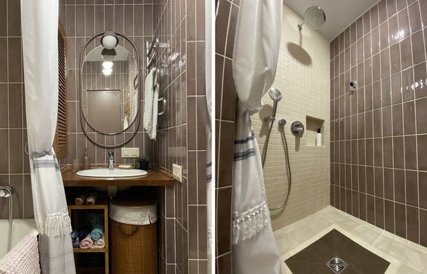Классные решения для вашего интерьера — вдохновляйтесь и берите на заметку! Эту ванную комнату дизайнер Ольга Изотова обустроила для своих родителей. В этом ей помогала ее дочь Анна. На площади 4 кв. м им удалось разместить полноценную ванную, душевую и продумать хранение, чтобы пожилым людям было удобно и комфортно. Для отделки взяли микс разной плитки. На полу — квадратная двухцветная плитка в шахматной раскладке (точно такую же использовали в прихожей), прямоугольная коричневая плитка — на стенах. Зоны ванной и душа выделили мозаичной светлой плиткой. Под ванной соорудили жалюзийный экран, за которым скрыли доступ к коммуникациям и предусмотрели места для хранения. Шторку закрепили на встроенный в потолок карниз. Между душем и ванной находится раковина. Она встроена в деревянную столешницу из лиственницы, покрытую палубным лаком. По левую руку от раковины — шкаф с жалюзийной дверцей, за ней находятся водонагреватель и коллектор. Под раковиной есть выкатной небольшой стеллаж и выкатн