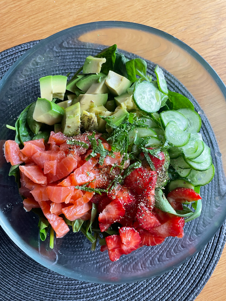 А на фото must try салат: лосось / листья шпината / огурец / авокадо / клубника / мята / итальянские травы