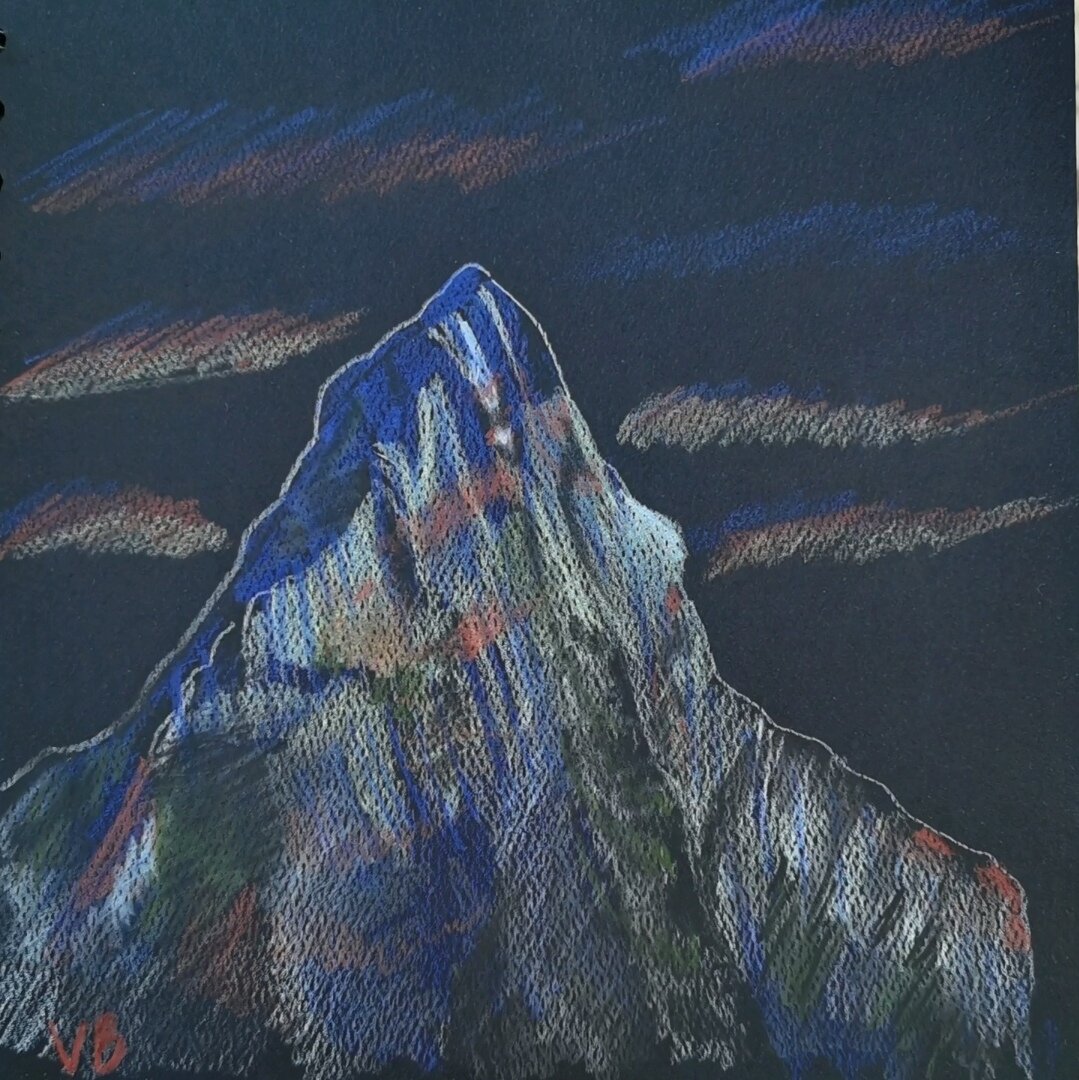 Пошаговое рисование цветными карандашами (кадры из марафона "Горы") Шаг 1. Рисовать будем на черной бумаге, набросок сделаем светлым оттенком, у меня это оттенок слоновая кость 103 номер (Polychromos) Шаг 2. Этим же цветом, а также синим карандашом (ультрамарин 120 номер) добавим области света и тени на горе Шаг 3. Добавим серыми оттенками, красным цветом (венецианский 190) области, где видны части горы, а жёлтым часть снега Шаг 4. Раскрасим темные участки черным карандашом, чтобы усилить контрастность, и зелёным (оливковый 173), усложнив оттенок Лёгкий скетч готов!