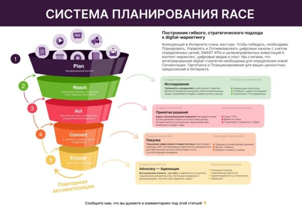 Пиарщики тоже пользуются специальными формулами в своей работе. Одна из них – система RACE. С помощью неё строится планирование и реализация любой PR-стратегии, PR-кампании или PR-акции. RACE это: R – Research – исследование. A – Action – действие. C – Communication – коммуникация. E – Evaluation – оценка. То есть это 4 основных этапа, по которым можно проводить PR-кампании, не забыв важные моменты при планировании. Разберем подробнее каждый этап. Первый этап – исследование: Здесь мы анализируем текущую ситуацию: целевую аудиторию, ситуацию на рынке, конкурентов, информационное поле вокруг нашего бренда/кампании. Это нужно для выявления проблем, которые предстоит решить через нашу PR-акцию. Второй этап – действуем. Определяем в какую точку в итоге хотим прийти. Формируем цели и задачи, продумываем конкретные шаги (план PR-кампании) для достижения целей. Сюда же входит разработка ключевых сообщений, которые хотелось бы донести своей целевой аудитории: смыслы, тексты сообщений, визуальн