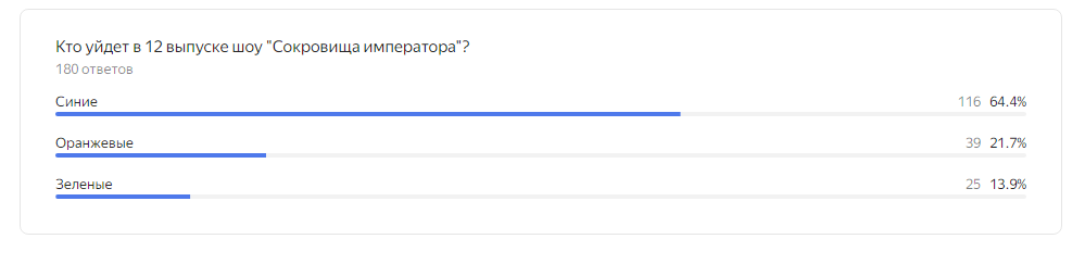 Здравствуйте, мои дорогие! Обсуждаем сегодняшний 12 выпуск шоу "Сокровища императора" от 2 июня 2024. Кто пришел последний, кто вылетел, и что было? Напомню вам, что в прошлый раз справедливость восторжествовала (по мнению многих зрителей!) и ушли с проекта "Розовые" - Мария Погребняк и Алана Мамаева. А потом мы с вами рассуждали, что значил поцелуй в исполнении Ольги Бузовой и Давы. Было ли это "Прощай" или наоборот - "Поздравляю, ты в финале?" Сегодня страсти будут накалены до предела, ведь остались три пары, шесть человек, и один приз! Вот наши с вами ответы на голосовании: Все уверены, что уйдут сегодня "Синие"! Дава и Арман вручили Чёрную кошку паре "Зеленых". Финалисты сегодня все три пары. А поцелуй был проверочным.