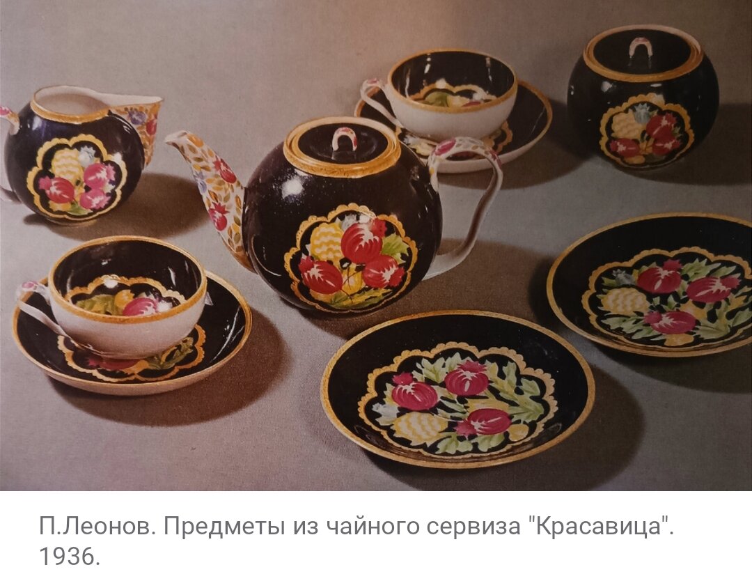 Хочу с вами поделиться историей создания сервиза «Красавица» П.В. Леонова, описанной в книге Ю.Арбата «Фарфоровых дел мастера». «Готовили сервиз на Всемирную выставку в Париже, Леонов сделал тогда несколько рисунков. Идея использовать «Агашку» пришла художнику в конце работы. Рисунок родился сразу, и Леонов дал его на исполнение в цех старому живописцу Хрисанфу Степановичу Салину. Леонов зашел в лабораторию и услышал какую-то старинную русскую песню — веселую, ухарскую. Пели работницы. — Как назовем сервиз, Петр Васильевич? — спросил Салин. На обороте выставочных вещей полагалось писать название. — А как ваша песня называется? — спросил Леонов у девушек. — Очень она по своему духу к сервизу подходит. — «Красавицу» поют, — ответил за всех Салин и тут же добавил: — А знаете, вот и имя есть. Пишу на чашках: «Красавица». И написал. А сейчас это название значится и в музеях и в книгах по истории фарфора. На выставке в Париже Петр Васильевич Леонов получил Большую золотую медаль, Дулё