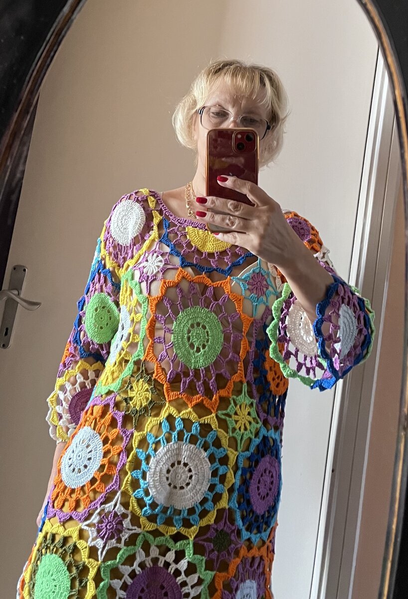 Всем хорошего дня!! Сегодня выходной, сижу пока дома, муж отдыхает, а потом пойдём куда-нибудь погулять и пообедать. Скорее всего в мол. Зато вечером буду свою любимую передачу смотреть « Три аккорда», очень люблю 👍👍 А пока покажу вам свою тунику , связанную крючком из отдельных элементов. Модель не я придумала, сейчас и придумывать не надо, всё в интернете. Это не то что раньше, журналы , или кто-то что-то покажет. А сейчас красота А теперь моя работа! Найдите три отличия 😃😃. Сначала я хотела просто попробовать связать мотив, и нитки были только фиолетовые «ирис» , зелёные и белые. Вот с этого всё и началось. Связала три мотива, а потом побежала докупать нитки другого цвета . Вот что получилось. Когда я её выгуляла, то получила заказ , сделать точно такую, но белого цвета , модель кардиган, то есть открытая. А потом уже я и себя не обделила и связала по той же схеме длинный кардиган. Схему, к сожалению, не нашла. Но рисунок простой, если кто-то заинтересуется, я пои