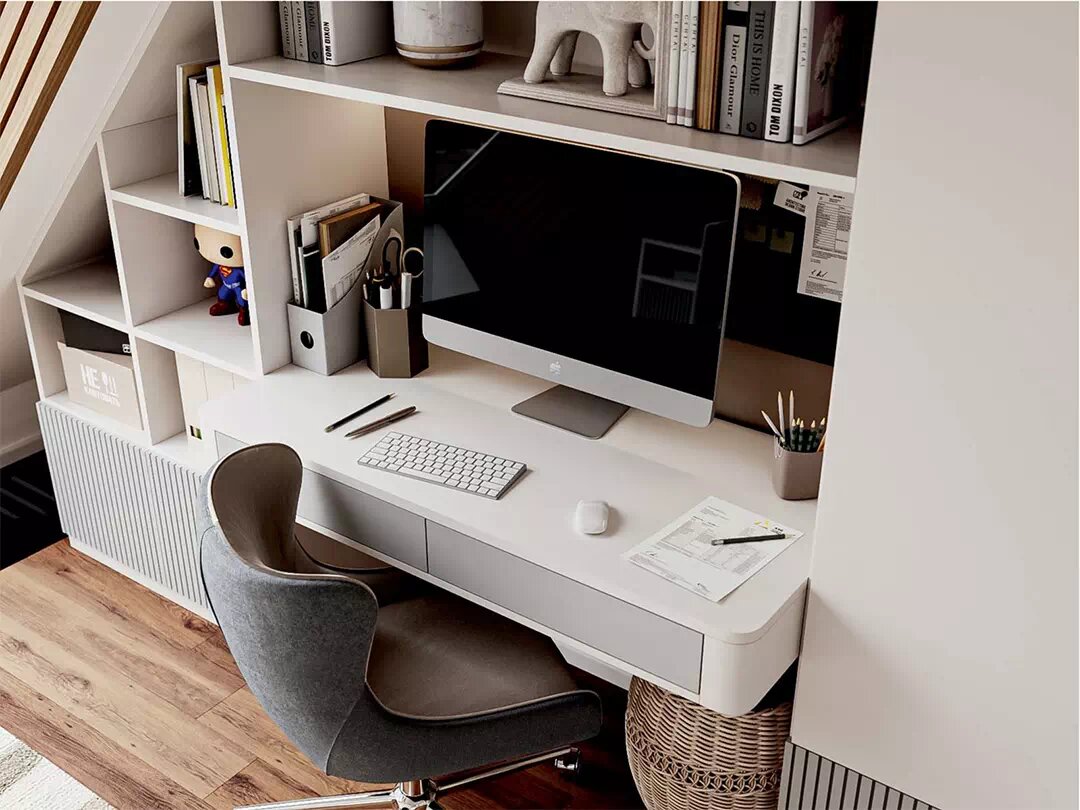 Мебель в детскую комнату для мальчика 5 лет, адаптированная под нестандартную геометрию помещения. Кликайте и смотрите подробнее Мебель в детскую мальчика 5 лет изготавливалась с учетом наличия нестандартного наклона одной из стен и размещения в ней оконного проема. В комнате есть еще одно небольшое окно и пара дверей. В простенке между ними встроен четырехдверный шкаф с антресольным пространством. Нижние распашные дверцы с белыми фасадами украшены длинными тонкими прямоугольными ручками из дерева. Фурнитура идеально сочетается с напольным покрытием, выполненным в деревянной фактуре, и реечной отделкой по оконному контуру. Угол наклона стены безупречно обыгрывает мебель для мальчика дошкольника, установленная в рабочей зоне. Корпус открытого стеллажа, предназначенного для хранения учебных принадлежностей и инструментов для хобби, изготовлен в виде домика с покатой двускатной крышей. В него интегрирована подвесная прямоугольная столешница с парой выдвижных ящиков. Стул – мобильный, с ме