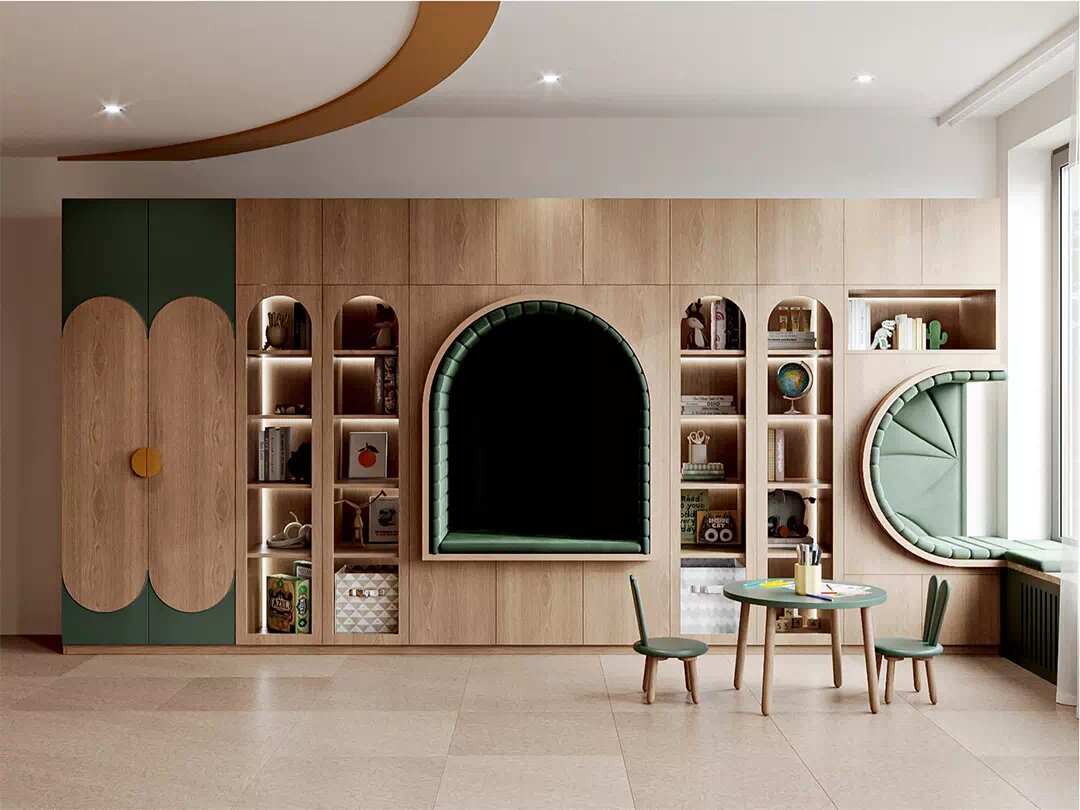 Мебель для детской комнаты девочки с учебной зоной, огромной системой хранения с эффектными решениями в конструкции. Смотрите подробнее Мебель в детскую девочки изготовлена из натурального дерева, поэтому выглядит роскошно, богато, элегантно. Система хранения реализована с перспективой, на вырост. Она довольно вместительная, нейтрально оформленная, поэтому отлично подойдет как дошкольнице, так и подростку. Шкафы с единым корпусом и антресольным пространством установлены вдоль одной из стен. Гардероб, в котором ребенок будет хранить одежду, обувь, белье, аксессуары, занимает крайнее расположение. Две его распашные дверцы сверху и снизу окрашены в темно-зеленый цвет. Накладные полукруглые оранжевые ручки объединяются в круг. С другого конца конструкции располагается место для отдыха – мягкая скамья в форме полукруга, повернутая в сторону окна. Ее продолжение – на подоконнике. По центру мебельной системы размещается еще одна глубокая ниша в виде арки. Она полностью отделана тканевыми рель