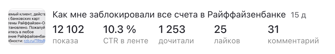 Всем привет! Еще совсем недавно (2 недели назад) я писала пост про первые 50 подписчиков на Дзене: А уже сегодня цифра перевалила за 100! Спасибо всем, кто меня читает и задает вопросы. Я надеюсь, что мой контент полезен для вас. Уже по традиции, делаю краткий обзор статистики с канала. За эти 2 недели статистика сильно поменялась. Самой продвигаемой оказалась статья про то, как меня заблокировали в Райфе - 12 102 показа. Она же оказалась и самой комментируемой. Для сравнения, до этого самой продвигаемой статьей была статья про варианты подработки. Сейчас на ней 7652 показа. Эта же статья принесла мне больше всего новых подписчика - 48 человек. Для сравнения - статья про Райф принесла мне всего 10 подписчиков. Что очень радует из статистики - мои подписчики почти всегда дочитывают статьи до конца. Цифра варьируется от 80 до 100%. Подробнее про карту дочитываний: Вот статистика по самым дочитываемым статьям: И статистика по самым не дочитываемым: На самом деле ставки на статью пр