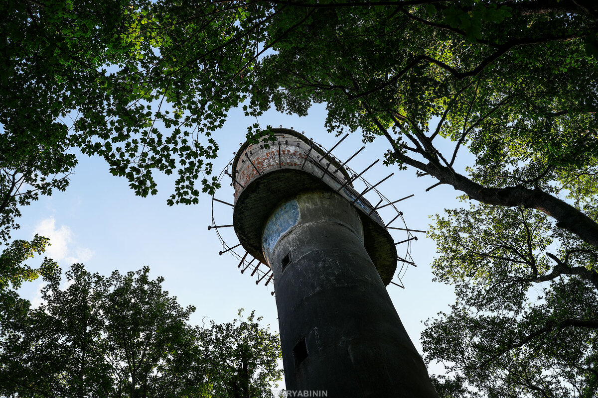 Если не знать где расположен нужный объект, рассмотреть его через заросли попросту невозможно. Достаточно отойти на пару шагов в сторону и большое бетонное сооружение растворяется в весенней зелени Куршской Косы. Это сохранившаяся башня управления огнем железнодорожных батарей в паре километров от Зеленоградска, если знать куда идти и не потеряться в диких джунглях федерального заповедника, в котором забыли, что такое ухаживать за дорожками, куда призывают на прогулку туристов и жителей. Подходим ближе и вот через расступившуюся листву деревьев начинает просматриваться заброшенный военный объект, по назначению похожий на тот, что мне доводилось встречать во Франции, на полуострове Киберон. Учитывая близость расположения объекта к туристическим тропам, залазы в него заделаны, чтобы очередной неопытный искатель приключений не нашел их на свою голову и голову местной администрации. А так, побывать на такой вышке было бы очень интересно. Основание башни прикольно разрисованно, что делает е