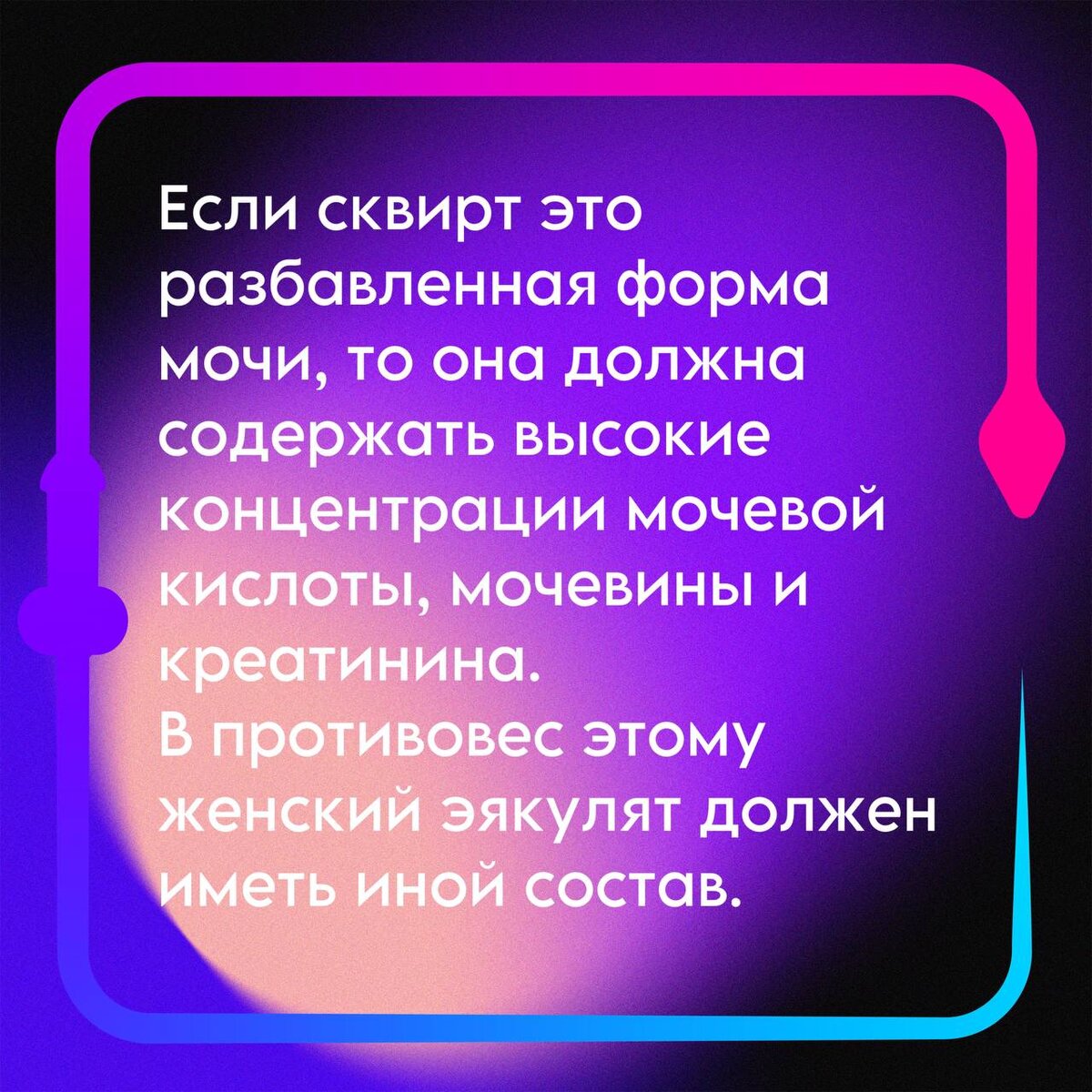 В 2011 году Международное мед сообщество в сфере сексуальности (ISSM) предположило существование двух разных явлений: сквирта и женской эякуляции. Гипотезу проверили на женщине-добровольце, 43-х лет: смотри ход эксперимента по добыче сквирта в первой части. Продвигаясь к выводам: мы уже упоминали, что сквирт и моча анатомически имеют один источник. Вторая жидкость (эякулят) обладает биохимическими характеристиками близкими к мужской сперме, но без репродуктивных клеток, гамет. Можно заключить, что эти две жидкости, хоть и связаны со сексуальной стимуляцией, все же различаются по происхождению. Сквирт – это выпускание разбавленной жидкости из мочевого пузыря, в то время как эякуляция – это выделение небольшого количества жидкости из женской простаты. Сильный женский оргазм не обязательно будет сопровождаться сквиртом. 🟣Почему во время секса может выходить не только сквирт, но и моча? Теоретически сфинктер мочевого пузыря должен быть закрыт во время возбуждения и оргазма. Но доказано,