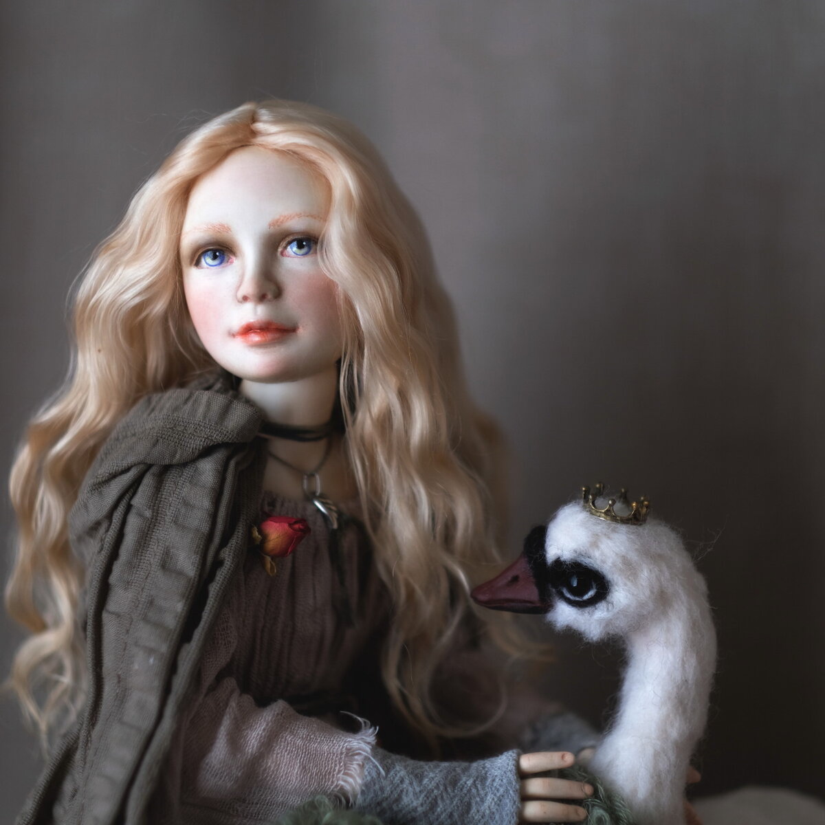 Галерея «Кукольный переулок» объединяет кукольников не только территорией, но и проектами, в которые приглашеют авторов. Для проекта «Андерсен» я сделала нежную красавицу Элизу из сказки «Дикие лебеди». Напомню главную интригу сказки: Злая ведьма наложила заклятие на братьев-принцев, превратив их в диких лебедей. Только терпение и мужество сестры Элизы могло снять злую волшбу ведьмы - голыми руками она должна была сплести из крапивы рубахи для каждого из братьев, не размыкая уст все время работы. Крапиву для рубашек Элиза собирала ночью на кладбище, за это её обвинили в колдовстве... Отрывок из сказки: «Жалкая кляча везла телегу, в которой сидела Элиза; на Элизу надели рубаху из грубого холста; её чудные длинные волосы были распущены по плечам, а лицо её было бледным, как снег. Даже по дороге к месту казни не выпускала она из рук своей работы: десять рубашек лежали у ее ног совсем готовые, одиннадцатую она продолжала плести. — Посмотрите на ведьму! — кричали в толпе.- Она не расстаётс