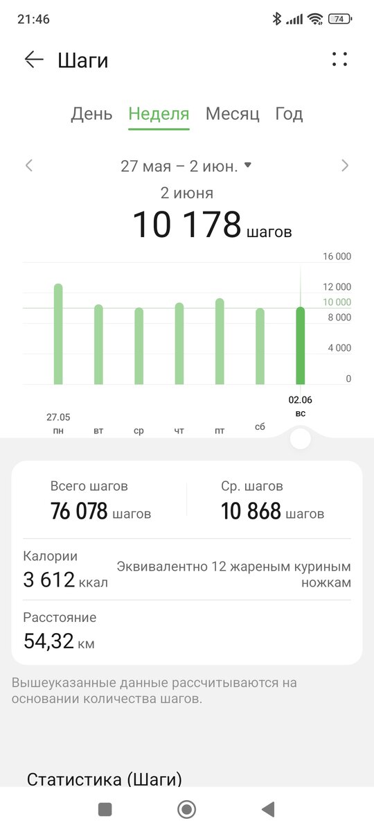 Всю неделю активно ходил по 10 тысяч шагов, ни дня не пропустил. Самое сложное - выходные, тут уже нет строгого расписания и себя приходится практически выгонять на улицу.