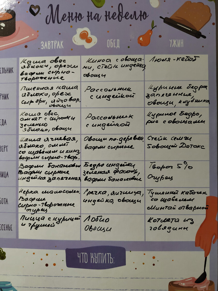 Пройдено за неделю 37609 шагов, в среднем 5373 шагов в день. Вес не изменился. Калорийность недельного рациона составила 8657 ккал, в среднем 1236 ккал в день. Затраты на питание составили 3530 руб в неделю, в среднем 461 руб в день.