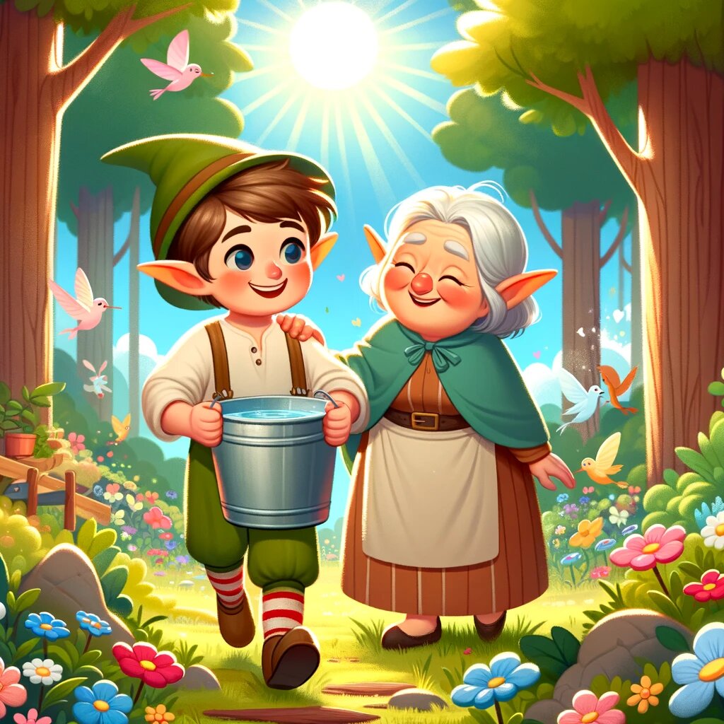 "Понятно," – сказала бабушка. – "Спасибо тебе, дорогой эльф. Ты действительно сделал меня счастливой и был очень полезным, помог мне донести ведро."