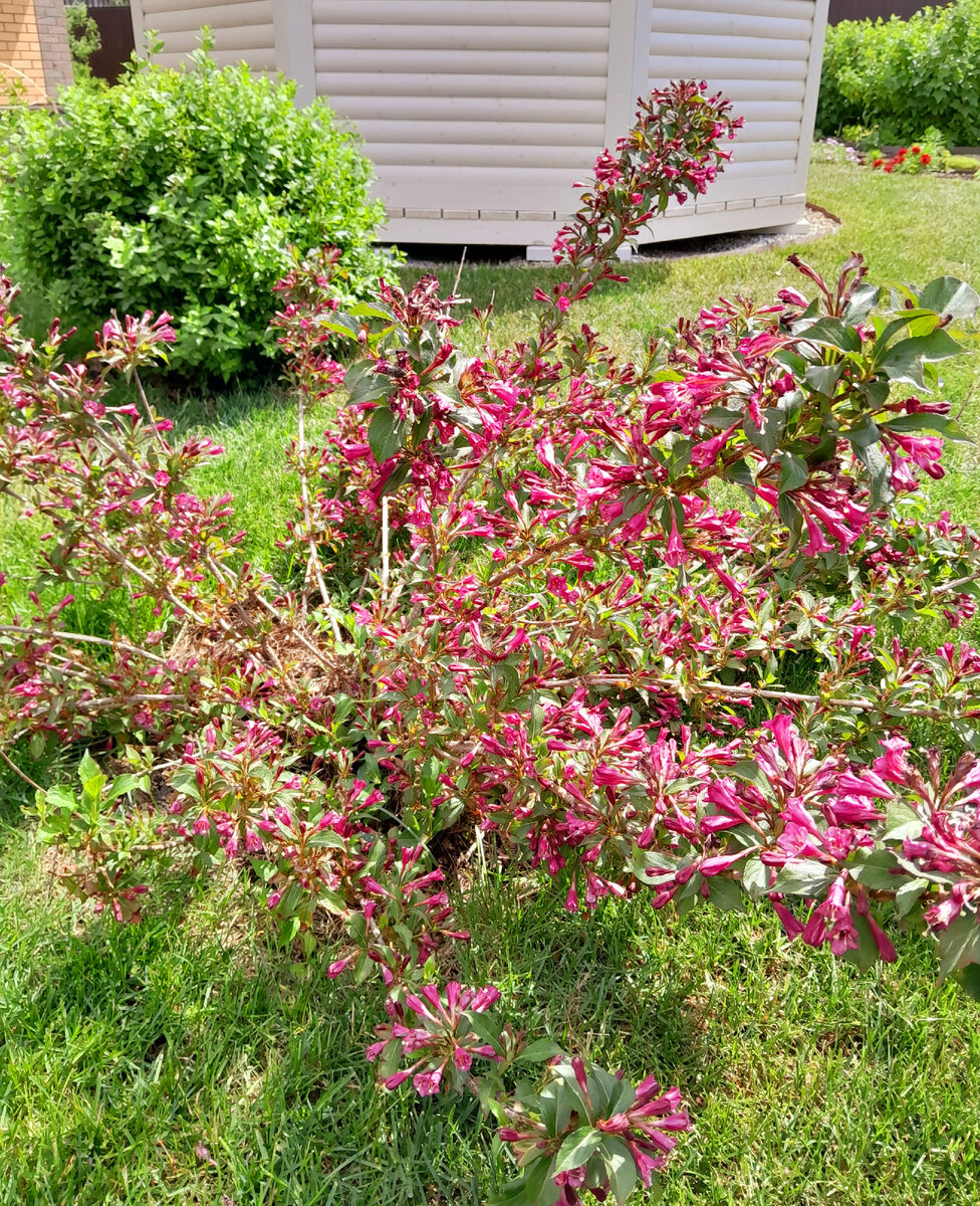 Я была в восторге от цветущей вейгелы - увидела ее у соседки. И мне тоже захотелось это цветущее чудо! Миллион розовых колокольчиков, густо осыпающих куст, никого равнодушным к красоте не оставит! Тоже отыскала вейгелу в местных питомниках. Достался мне сорт Стириака. Сейчас ей 6 лет: Погода творит чудеса этой весной - три недели назад снег с морозом - это 1 и 9 мая! А теперь крайняя неделя мая - за 30 жара... но Стириака все равно цветет! Это плюс. О минусах теперь. Мне не очень нравится форма куста - ветки лежат. Никак она уже второй месяц не встанет. Зимует с укрытием - пришпиливаю ветки к земле через хвою и текстиль. А теперь она лежит. Это минус. И еще минус - вейгелу надо укрывать. А хочется не заниматься этим. Чтобы растение само зимовало. Цветет она дважды за сезон - в мае и в конце августа. Красиво. Но недолго - недели две. Это тоже считаю минусом. У меня живет на солнце - при палящей жаре колокольчики корявенькие стали. Делаю вывод - заявлено, что сорт открытое солнце