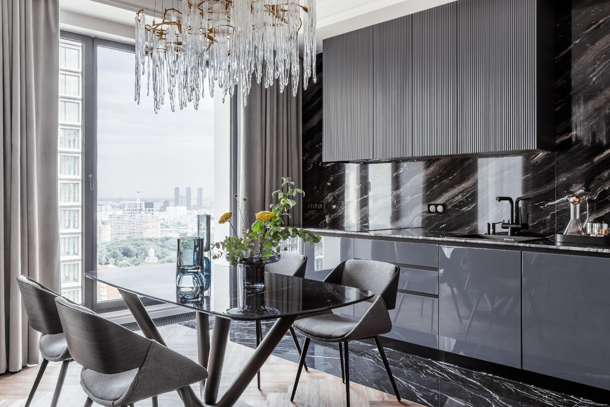 Двушка от ALEART DESIGN для молодого человека, который любит дерево, черный цвет и современный дизайн. В итоге получилась квартира мечты с уютной атмосферой и продуманной планировкой. В интерьере кухни мы видим игру контрастов черного цвета и дерева. Также здесь много глянцевых и стеклянных элементов — массивная акцентная люстра, керамогранит под черный мрамор, аналогичная столешница и глянцевая техника. Эти детали создают отблески и добавляют глубины интерьеру. Керамогранит под черный мрамор повторяется и в дизайне ТВ-зоны в гостиной, где он используется для акцентной отделки стены. Здесь же мы видим парящую тумбу, приставной столик на металлическом каркасе и удобный глубокий серый диван. Роскошный гардероб в сером глянцевом лаке в прихожей и подвесная тумба с зеркалом напротив сделаны на заказ. На небольшой площади дизайнер создала эргономичное пространство, которое будет максимально удобным. Ванная комната заслуживает особого внимания. Сложный комплект мебели индивидуального проекти