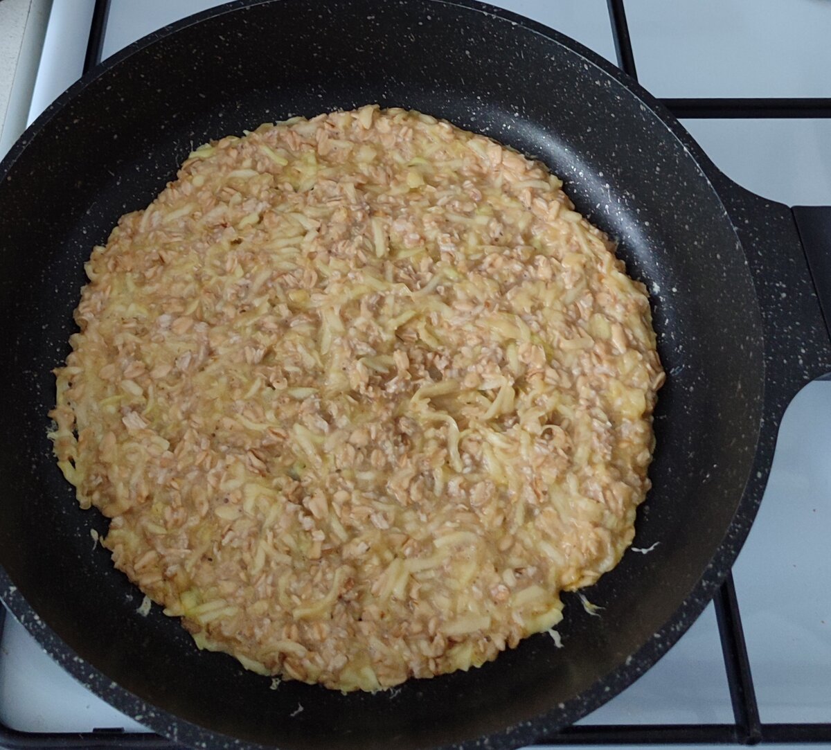 горч. мас. - 2г Приготовление: Кабачок натереть, вбить яйцо, добавить соль и хлопья. Всё перемешать и оставить минут на 15-20. Я готовила "тесто" для блина с вечера - это очень удобно - смешал все ингредиенты и оставил до утра в холодильнике. Безо всяких танцев с бубнами, в виде отжимания кабачка от лишней жидкости и перемалывания овсяных хлопьев в муку) Утром выложила тесто на разогретую сковороду, сбрызнутую маслом и разровняла его: Жарила на медленном огне под крышкой с двух сторон: А дальше открывается простор для фантазии - чем наполнить этот блин, чтобы было и вкусно и полезно) Я пошла по классике - помидоры + сыр.