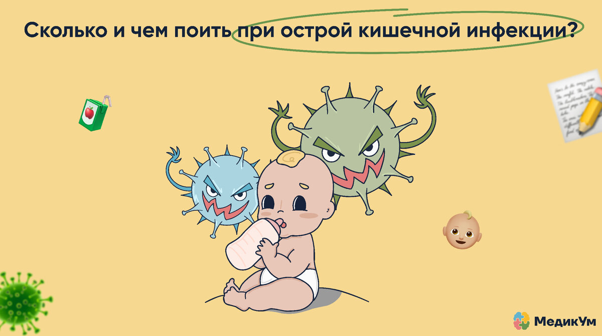У всех врачей уже на подкорке записано, что основное лечение острой кишечной инфекции - адекватная регидратация. Но родителям маленького пациента недостаточно просто сказать: “поите ребенка”. У них сразу же возникает много уточняющих вопросов, на которые у педиатра должен быть ответ: Давайте сегодня с этим разберемся, чтобы вы всегда могли уверенно рассказать своим пациентам, что делать. Поэтому в регидратации нужно всегда использовать специальные растворы. Они восполняют потерю электролитов и помогут жидкости лучше усвоиться за счет ко-транспорта натрия. 2. Как выбрать раствор? Существуют определенные требования ВОЗ к растворам для пероральной регидратации: Обратите внимание! Жидкости с избытком глюкозы (фруктовые сиропы, соки, газировки) увеличивают осмолярность в кишечнике и могут усилить диарею! Ими отпаивать нельзя. У детей должны использоваться растворы с пониженной осмолярностью - до 245 мОсм/л. Будьте внимательны, не все аптечные растворы удовлетворяют этому условию. 3. Сколь
