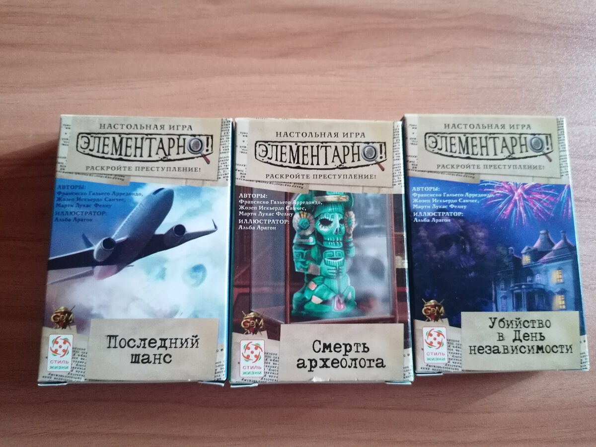Издательство: Стиль жизни Кол-во игроков: 1-8 Возраст: 10+ Время: 60 мин Сложность: "Убийство в день независимости" - сложный Остальные игры серии - средний Состав игры: колода из карт; правила игры. Жанр: кооперативная игра-детектив Во всех играх серии нужно разобраться, что же произошло. Каждая карта может навести на новую версию, подтвердить или опровергнуть имеющуюся. Из всей колоды нужно отобрать карты, которые ведут по ложному следу. Каждая лишняя карта заберет победные очки. Когда Вы будете уверены, что во всем разобрались, нужно ответить на несколько вопросов, выбрав правильный вариант ответа. Самыми первыми играми в серии Элементарно были: "Убийство в День Независимости", "Последний шанс" и "Смерть археолога". Поговорим про каждую. "Последний шанс" На борту самолета умирает пассажир. Что же с ним случилось? Дело не было слишком сложным и запутанным, словно ответ лежал на поверхности, показался даже банальным. Из этой тройки, я бы поставила его на второе место. "Смерть археол