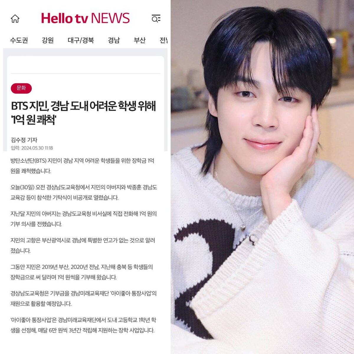 Сегодня утром (30-го) церемония внесения депозита состоялась в частном порядке в Управлении образования Кёнсаннам-до, в котором приняли участие отец Чимина и суперинтендант Кённам-до Пак Чен Хун. В прошлом месяце отец Чимина напрямую позвонил в офис секретаря Управления образования провинции Кённам и выразил намерение пожертвовать 100 миллионов вон. Родной город Чимина - Пусан, и он не имеет особых связей с Кённамом. В течение нескольких лет Чимин жертвовал 100 миллионов вон студентам Пусана в 2019 году, Чоннама в 2020 году и Чхунбука в прошлом году, прося их использовать эти деньги на стипендии. Управление образования Кёнсаннам-до использует пожертвование для финансирования проекта "I Like You Passbook Project" Фонда будущего образования Кённам. Проект "I Like You Passbook Project" - это стипендиальная программа, в рамках которой Фонд будущего образования провинции Кёнсаннам отбирает первоклассников и поддерживает их, откладывая 60,000 вон в месяц в течение трех лет. Источ
