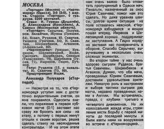 — Несмотря на то, что «Черноморец» уступил нам с достаточно внушительным счетом, он мне понравился. Одесситы знали, что поражение в первом кубковом матче (0:1) заставит нас сразу же бросить все силы на атаку, а потому с первых минут отошли к своим воротам, решив сделать ставку на неожиданные контрвыпады. И на этом этапе нам очень важно было отквитать пропущенный в Одессе мяч. Пенальти, назначенный за снос Юрия Савичева, помог нам это сделать. Но даже уравняв шансы, долгое время ситуация на поле оставалась неясной. «Черноморец» взбодрился и мощно пошел вперед. Имреков и Шелепницкий хорошо поддерживали наступление. А Гецко изрядно заставил нас понервничать в обороне. Спасибо Сарычеву, выручившему в нескольких очень сложных моментах.
