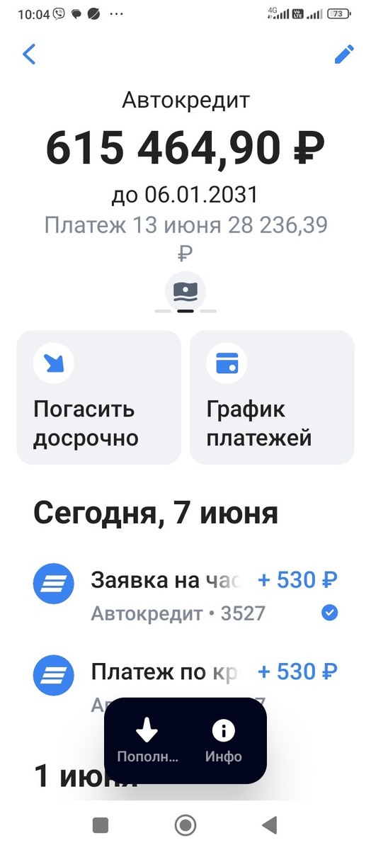 Привет, друзья! Мой автокредит потихоньку тает. Это радует. Ещё в начале июня сумма была 615464,90. Потом, 13 июня после досрочного погашения стала 601077,81 Ещё 13го июня сняли ежемесячный платеж, сумма еше уменьшилась . Последний платеж в сентябре 2026 года. Потом произошло приятное финансовое пополнение моего кошелька. Я продала на Авито разного почти на 10000, о чем писала вот тут=> И ещё при помощи следственного комитета я получила старый долг по зарплате по одному бывшему официальному месту работы. Эпопея с прокуратурой и следственным комитетом длилась более 2х месяцев, но результат отличный. Спасибо, ребята! И конечно я сразу же уменьшила свой автокредит, послала на досрочное погашение 105000. Сразу долг уменьшился по авто кредиту и стал 478088,42 Последний платеж теперь в марте 2026 года. На сегодняшний день осталось платить 21 месяц. Это год и 9 месяцев. За неполный июнь я сократила кредит на 137 376,48 И это еще не предел, июнь еще не закончился. Было бы не плох