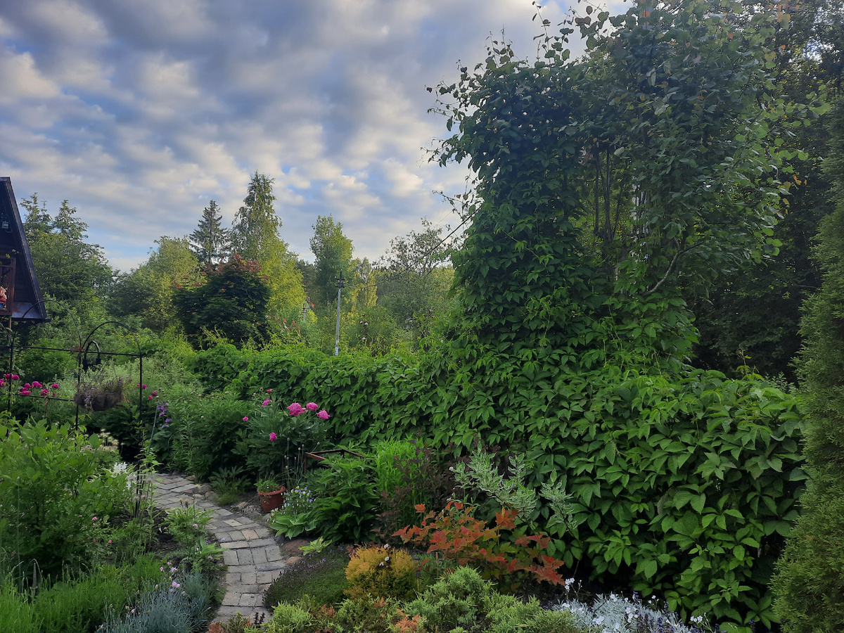 Лианы и садоводы бывают разные! Садоводы различаются по своим вкусам и пристрастиям, сады по регионам и микроклимату, лианы по их использованию. У меня их несколько, они разные, разным путем у меня появившиеся. Использую я их тоже для решения разных задач. Решила сегодня показать их вам в том виде, как они в середине июня выглядят. Понятно, что весной картинка была другая, осенью тоже многое изменится. Начну с девичьего винограда, не любимого многими. Мне он помогает спрятаться от дороги. Когда деревья и кусты были маленькими, виноград меня спасал абсолютно. Сейчас убраны по естественной причине несколько высоких кустарников около ворот. Вон, столб видно... Зато на осину забрался до макушки. Осенью красиво будет. Правее все укрыто сплошным ковром. Как вы понимаете, за такими зарослями можно прятаться. С соседями тоже хорошо прикрывает часть забора. Одну створку ворот укрыл. Есть у него, у винограда, одна заноза. Лезет везде. Рассказывают, что корни далеко забираются. У меня... Н
