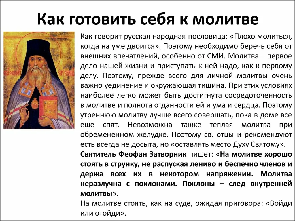 В практике молитвы Древней Церкви использовались разные позы, положения тела, жесты. Молились стоя, молились коленях, в так называемой позе пророка Илии, то есть стоя на коленях со склоненной к земле головой, молились стоя с воздетыми руками или лежа на полу распростёртыми. При молитве делали поклоны: земные и поясные, совершали крестное знамение. Из всего многообразия традиционных положений тела остались во время молитвы всего несколько. Это прежде всего молитва стоя и стоя на коленях, сопровождаемые крестным знамением и поклонами. Почему так важно, чтобы и тело участвовало в молитве? Почему нельзя просто молиться одним духом, но при этом лежать в кровати или сидеть в кресте? Вообще, конечно, можно молиться и сидя, и лежа: так мы обычно и делаем, когда болеем или путешествуем. Но в обычных обстоятельствах важно при молитве использовать те положения тела, которые сохранились в предании нашей православной Церкви. Дело в том, что дух и тело неразрывно связаны между собой. Дух не может б