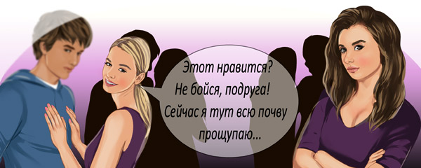 Никогда не показывай своего жениха подругам до свадьбы. Я приехала на выходные и подруга мне доложила, что у нашей однокласснице Любы появился парень. А этот парень нравился ей. Да, кто же это такой, почему не знаю. Если про жен говорят: жена не стена – подвинется, то, что говорить о парне, который еще не стал женихом. Одноклассница Люба уверяла нас, что он ее любит. Любит -не любит, проверим. Хороша парочка – кулик да гагарочка. Девушки народ хищный, коварный, эгоистичный. Ее любят, а меня... Нужно было подыграть подруге, чтобы он обратил внимание на нее и вовремя найти паренька, чтоб не