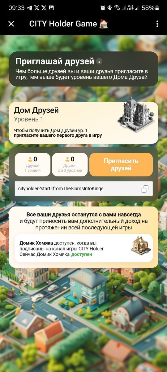 Всех приветствую на моем канале, буду делиться на просторах интернета, разными сетапами! Вот вышла еще одна фармилка, пока что на начальной стадии разработки, но в будущем будет много заданий, постройка дома и т.д. вообщем разработчики нас должны порадовать, а пока переходим по ссылке на бота: Встаем в очередь, за домом! чем Больше вы пригласите друзей тем Выше и Лучше Ваш дом!!) Пока на этом все, пост будет дополнятся! Либо открою новый! Я дарю тебе Домик Хомяка 🎁🛖🐹. Забери его сейчас и стань одним из первых участников самой горячей build-to-earn игры в Telegram — CITY Holder 🏠. Будь одним из первых и пригласи своих друзей 👨🦱👳♂️🧔♂️🙎♀️👩🍳.