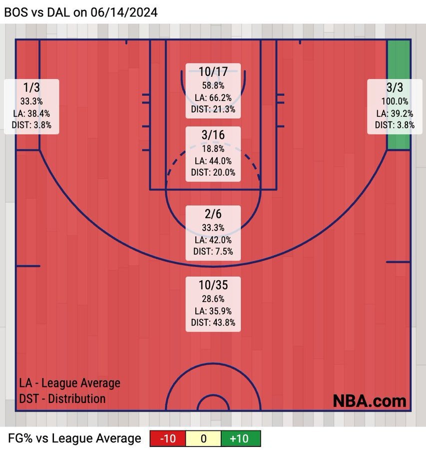 «Селтикс» дошли до того, что у них процент трехочковых практически не отличался от процента попадания с игры (36% и 34%), при этом они выбросили лишь на 4 трехочковых больше, чем «Даллас» (у которых аж 37). И это как раз показывает, что это именно «Мэвс» ответственны за такой результат: они полностью остановили проникновения под щит, за счет которых и работает атака «Бостона». Особенно тяжело было в те минуты, когда садился Эл Хорфорд и появлялся Ксавьер Тиллман. Джейлен Браун выступил невразумительно – 3 из 12 с игры, 2 потери, Джейсон Тейтум был немного лучше лишь в первой четверти – 4 из 10, 3 потери, Деррик Уайт сбоил с периметра – 2 из 8, Дрю Холидэй ошибался в чужой «краске» – 2 из 6. У «Бостона» не нашлось никого, кто мог бы вскрыть эту агрессивную оборону. А «Даллас» гораздо прагматичнее смещался на своей половине и выходил на подстраховку только тогда, когда это действительно требовалось.