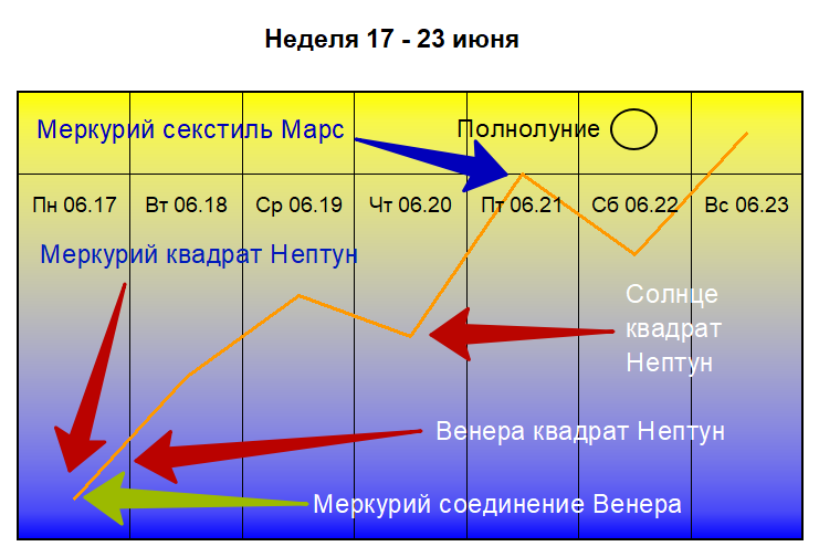 ГОРОСКОП ЗДОРОВЬЯ на НЕДЕЛЮ 17 – 23 ИЮНЯ Внимание В прогнозе даются советы и рекомендации связанные с консервативным лечением. Не с хирургией и тому подобными активными вмешательствами в дела организма. На это и следует ориентироваться в борьбе за здоровье. Растущая Луна идёт к Полнолунию 22 июня. Все полости организма расширяются, что облегчает движение кислорода и питательных, лекарственных веществ, что, понятное дело, облегчает борьбу за здоровье. Реализуйте начатую после Новолуния программу оздоровления с максимальной физической и эмоциональной выкладкой. После Полнолуния наступает время благоприятствующее стабилизации достигнутых успехов в оздоровлении, накоплению энергии, питательных и лекарственных веществ в организме. Повторение и в лечении и в физиотерапии – мать учения! Но в период нескольких дней вокруг Полнолуния будьте особенно внимательны к здоровью. Ночью 17 июня Луна в Весах. Можно проще и быстрее активизировать и стабилизировать дыхательную систему. Активен газообмен в