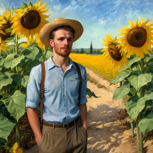 - Стиль одежды: Ван Гог выбрал бы непринужденный стиль одежды — простую льняную рубашку и брюки, возможно, с элементами деревенского стиля. Он мог бы дополнить образ соломенной шляпой, чтобы защититься от солнца во время прогулки.