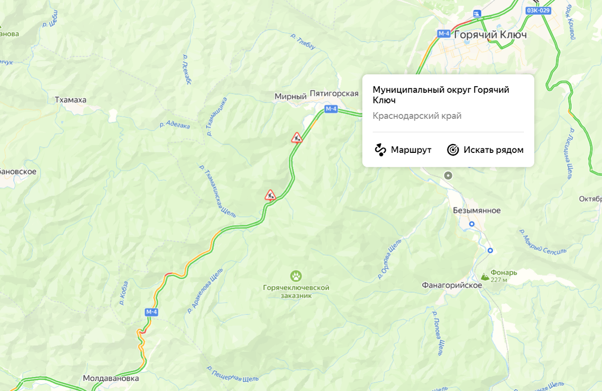 По данным сервиса «Яндекс Карты», автомобильный поток в районе Горячего Ключа на трассе М-4 «Дон» растянулся на два километра. Сервис показывает, что водителям потребуется не менее 20 минут на преодоление затора. Еще одна пробка наблюдается в районе села Хребтового. Длина «желтого» участка пути на карте, по которому водители транспортных средств едут с небольшой скоростью, составляет более 5 километров. Здесь тоже доехать быстро и с ветерком не получится. Помимо прочего, движение затруднено в обе стороны перед поселком Ильским и в районе станицы Холмской (трасса, ведущая к Анапе и Новороссийску). По направлению к Чёрному морю затор растянулся 4 километра. Читайте нас в Telegram. Скриншоты: "Яндекс Карты"
