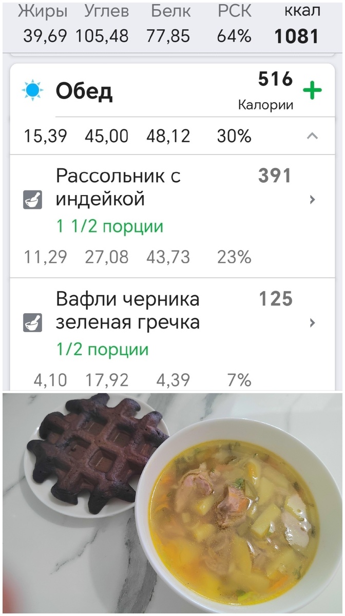Сегодня на обед рассольник из индейки и черничная вафля. Вафли делала по другому рецепту: 200 гр черники, на муке зеленой гречки 100г и с двумя яйцами , с уменьшенным количеством кокосового масла 10 гр. Получились не такие вкусные и нежные, как предыдущий вариант, но все равно калорийные очень, 6 штук, 125 ккал штука.