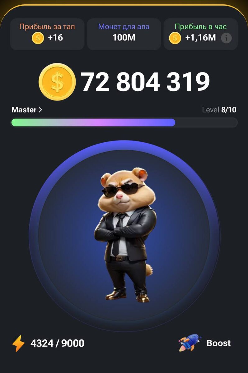 - Игровой процесс: На главном экране нажимаем на изображение хомяка, чтобы заработать монеты. Используем всю доступную энергию, затем переходим в раздел "Boost" и активируем "Full energy". Это можно сделать до 6 раз, что в итоге добавит примерно 8500 монет на ваш баланс. В начале игры активное прокликивание хомяка поможет быстрее собрать монеты для первоначальных улучшений.