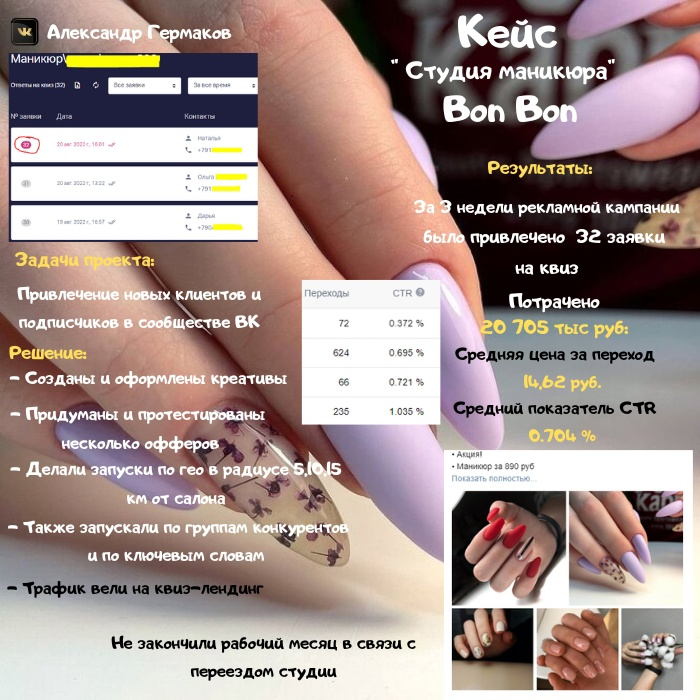 Сформировать продающие текста Трафик мы вели на квиз-лендинг, данная цель отлично себя проявила этой нише и нам удалось привлечь 32 заявки Объявления были такого плана: Результаты с рекламного кабинета: Было найдено наиболее кликабельное объявление, которое запускалось на разные аудитории Если вы хотите, что бы я помог составить стратегию продвижения для вашего бизнеса, напишите мне https://vk.me/targetvk_aleksandergermakov и мы проведём с вами масштабирование вашего проекта.