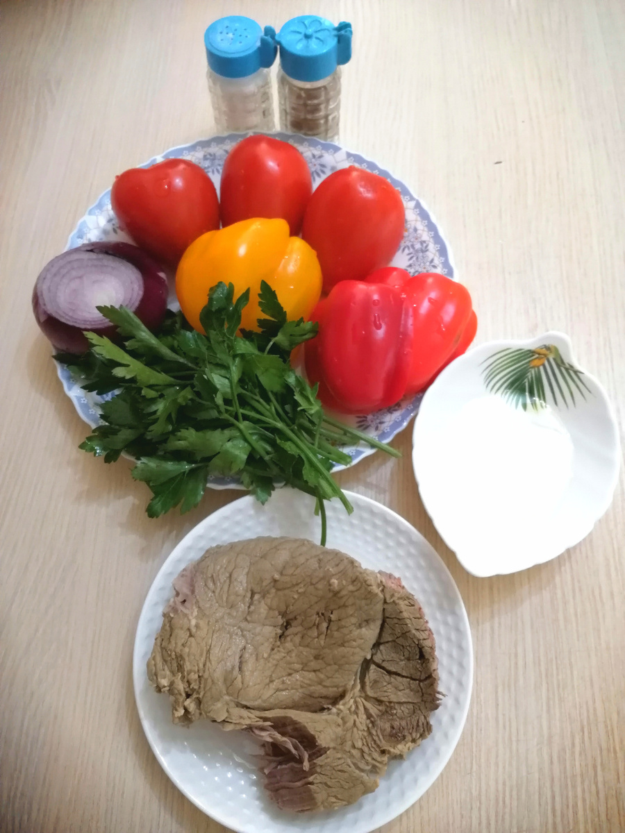Друзья, всем привет! Хорошего настроения, мира, добра, позитива! А для этого нужна вкусная, здоровая еда, как основа. Поэтому предлагаю сегодня приготовить очень вкусный салатик с говядиной. Он не только вкусный, но и очень полезный. Нам понадобится: отварная говядина 300 гр, 3 помидора, 2 сладких перца (я взяла 1 красный и 1 жёлтый), 1 салатная луковица, небольшой пучок зелени (у меня петрушка). Зелень можете добавлять любую, на ваш вкус. Идеально подойдёт кинза, но у меня сегодня не было, поэтому с петрушкой готовлю. Как всегда понадобится соль, перец и заправка. Здесь подойдёт и майонез и растительное масло, как вам больше нравится. Я очень редко использую майонез, поэтому готовлю этот салат с маслом. Остаётся порезать все ингредиенты. Мясо нарезаем брусочком или кубиками, лук полукольцами. Перец надо порезать тонкими полосками, а зелень порубить, как можно мельче. Помидоры нарезаем кубиком. Складываем всё в салатник, солим, перчим и заправляем маслом. Это очень вкусно, сытно