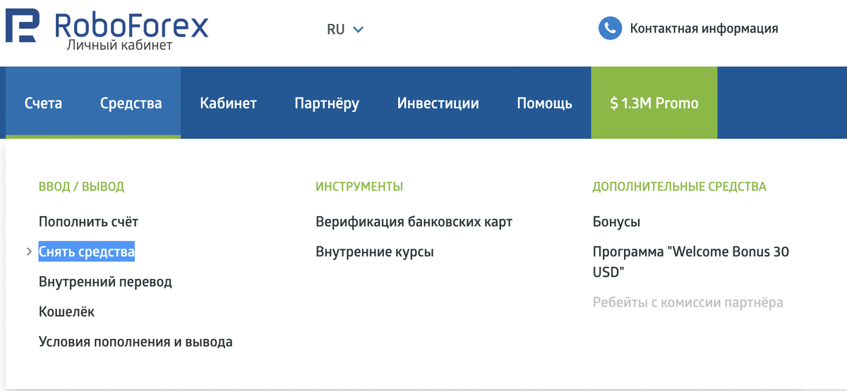 Авторизация в личном кабинете используя логин (адрес электронной почты) и пароль. https://my28.roboforex.org/en/login/ Зачастую трейдеры выводят прибыль на отдельный лицевой счет, на котором они хранятся и не участвуют в торговле. Прежде чем приступать к выводу делаем нужный счет активным. https://my28.roboforex.org/ru/trading-account/accounts/ перейдя по ссылке откроются все лицевые счета, если их слишком много воспользуйтесь поиском по странице используя сочетания клавиш CTRL+F затем кликните мышкой по счету. Узнать какой счет в данный момент является активным можно по желтоватому цвету которым он подсвечен, так же он отображается в правом боковом меню. Под словом "активный" подразумевается что выбран определенный счет с которым вы намерены совершить необходимые действия, такие как вывод средств, перевод на другой счет в рамках личного кабинета и.т.д. Наводим курсор мыши на пункт Средства в появившемся меню кликаем Вывод средств либо просо переходим по ссылке https://my28.roboforex.