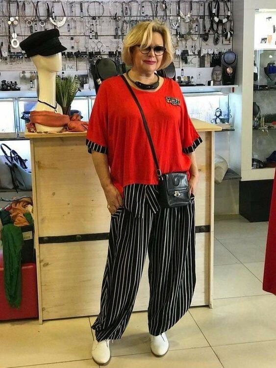 - Эффектно и смело. Для смелой женщины этот костюм более чем подходит – он подчеркивает ее зрелую красоту и в то же время позволяет выразить индивидуальность. Верх костюма – свободного силуэта ярко-красная блузка, низ - такие же свободные черные брюки с белыми тонкими полосками. Блузка по краям рукавов и нижнему краю отделана той же тканью, из которой сшиты брюки. Блузка имитирует многослойность, позволяя скрыть под собой возрастные недостатки фигуры.