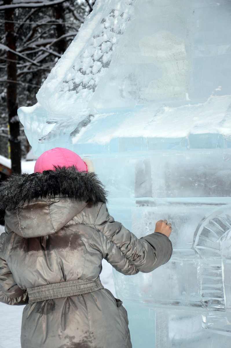 Продолжаю вас посвящать в тайны Резиденции Деда Мороза.Нам повстречался мастер, печатающий памятные монеты для всех желающих.Он стоял возле небольшого станка, куда нужно было сунуть рублёвую монетку, с усилием прокрутить ручку и на выходе получить отпечаток усадьбы.Интересное устройство.Наверняка местные кудесники и денежные купюры могут напечатать при желании.Шучу.Ещё нам встретилась ледяная избушка из сказки про Зайца и Лису(где Лиса Зайца из дома выгнала).Доча на память, как и другие детишки, оставила монетку на прозрачной стене фигуры. Были здесь и совсем обычные развлечения, доступные нашим детям в любом дворе.Например, самая обычная деревянная горка.Народ там не толпился, так как и дома этого добра хватает, всё-же люди сюда едут за чем-то необычным. Прогуливаясь по усадьбе, я старался подробнее разглядеть местную архитектуру.Вокруг стояли, как совсем заурядные строения, так и уникальные, созданные верной рукой умелых зодчих, сохранивших старорусские основы строительства бревенча