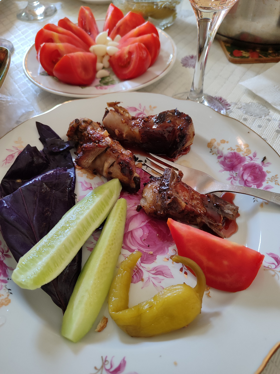 И завершение сегодняшнего праздничного семейного дня. За столом мы ели вкуснейший и нежнейший шашлык из баранины на ребрышках: Шашлык ели с наршарабом: Кто-то из вас знает, что такое наршараб?) Тогда вы знаете - как это вкусно 😋 Я потом ещё и рыбку с этим же гранатовым соусом ела 🤤 Гарниров мы никаких не готовили - на столе было много овощей и зелени. Потом мы хотели сфотографироваться с мамулей, но между нами вклинился Егор: До чего тёплый ребёнок... Так любит обниматься, целоваться, общаться) Очень тактильный маленький человечек. Занимается этот сладкий мальчик боксом и скоро у него будут соревнования, а мы все будем за него болеть 💪 Потом мы пили чай со сладостями: А мама с Эльдаром ещё и мороженое ели) Я от мороженого отказалась - и так сегодня с едой перебор) А из активностей у меня сегодня только шаги, даже приседаний не было) Надеюсь, вы сегодня не филонили в отличии от вашего предводителя, дорогие мои участники челленджа? 😁 Напишите в комментариях, пожалуйста, кто продолжае