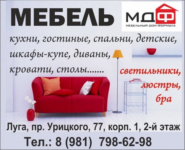 "Мебельный Дом" в Луге Ленинградской области: кухни, корпусная и мягкая мебель в наличии и на заказ. Светильники, люстры.