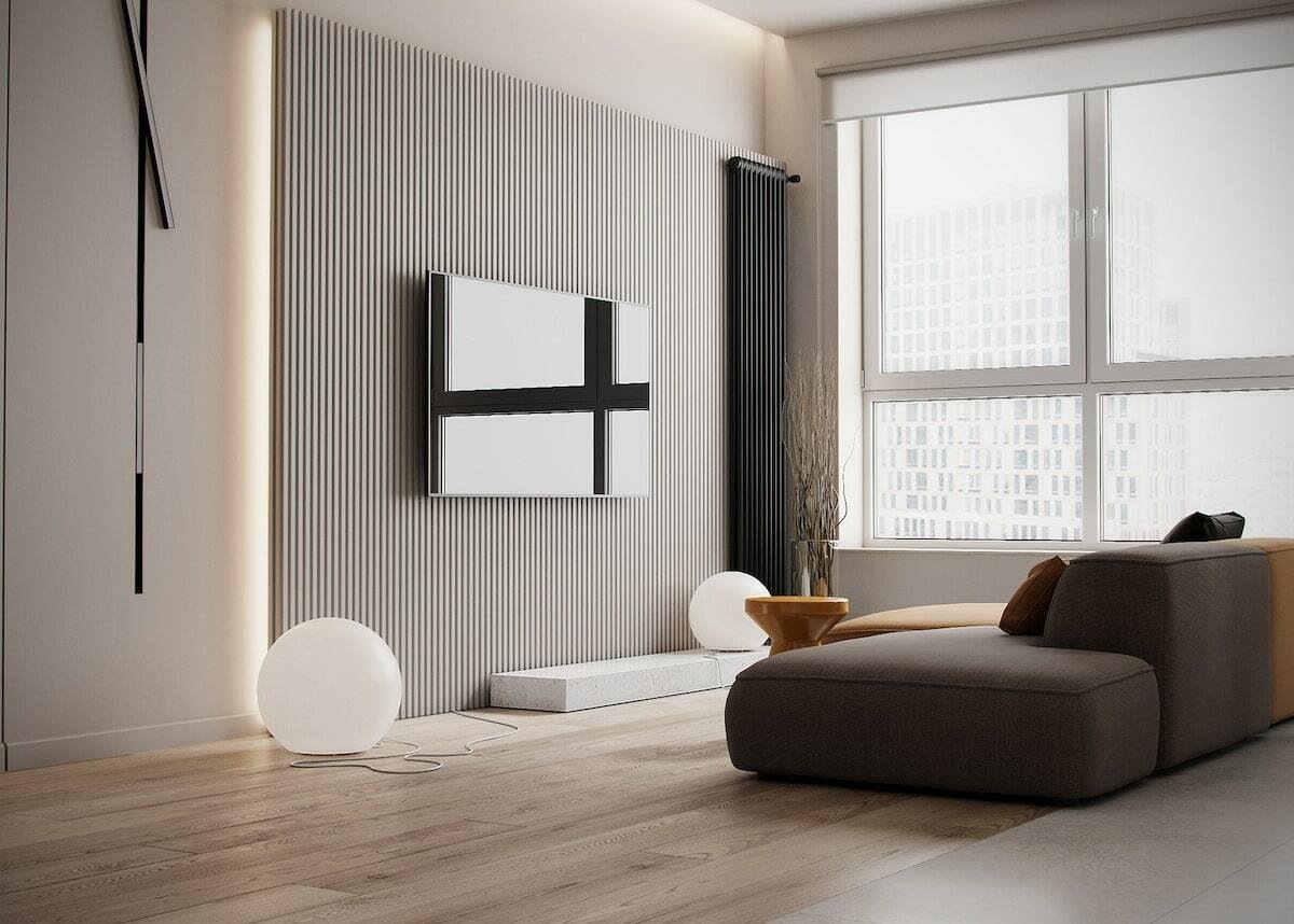Кому подходит: Большим и просторным (от 80 кв. м) новостройкам, с панорамными окнами и высокими потолками. Кому не подходит: В хрущёвках и брежневках чистый минимализм сложно реализовать из-за скромных площадей. Бюджет: от 1 000 000-2 000 000 рублей на квартиру 80 кв.м. Сложность самостоятельного исполнения: ★★★★ Оформление стен: Ровные, окрашенные; подходят также обои под покраску и декоративная штукатурка с монотонными фактурами. В отделке акцентных стен может применяться дерево, камень (натуральный или искусственный), металл и стекло. Исключены любые орнаменты, узоры и т. п. Санузел Чаще всего для отделки используют крупноформатный керамогранит лаконичных цветов. Двери: Чаще всего используются двери скрытого монтажа, которые совпадают по отделке со стеной, на которую они монтируются. Пол: Напольное покрытие — дерево, в некоторых случаях возможен ламинат или кварцвинил, а также камень или крупноформатный керамогранит в сочетании с микроплинтусом или плинтусом скрытого монтажа.