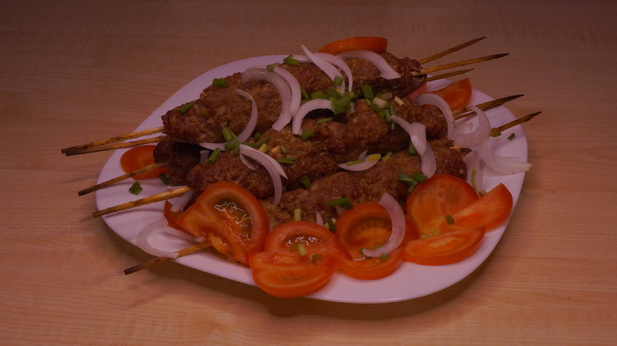 Ингредиенты: Приготовление: Говядину и курдюк мелко нарубить или пропустить через мясорубку, лук мелко нарезать. Объединить говядину, курдюк, лук и специи и вымесить руками. Разделить на порции ≈ 200 гр. и налепить в форме колбасок на шпажки. Выложить люля-кебаб на противень с решёткой. Запекать 20 – 25 минут при температуре 170 – 180°C в предварительно разогретой духовке. Приятного аппетита!