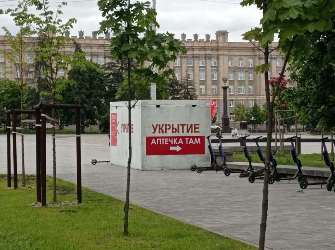 Остановки общественного транспорта укрепляли мешками с песком, такие можно встретить и сейчас на не сильно оживленных улицах. На центральных проспектах, площадях, в парках и скверах выросли бетонные коробки, сложенные из плит, высотой чуть более двух метров. Это сооружение сразу же бросается в глаза приезжему человеку: на белом фоне крупными красными буквами написано «Укрытие», а чуть ниже подпись со стрелкой «Аптечка там». Внутри убежища могут уместиться до сорока взрослых человек.