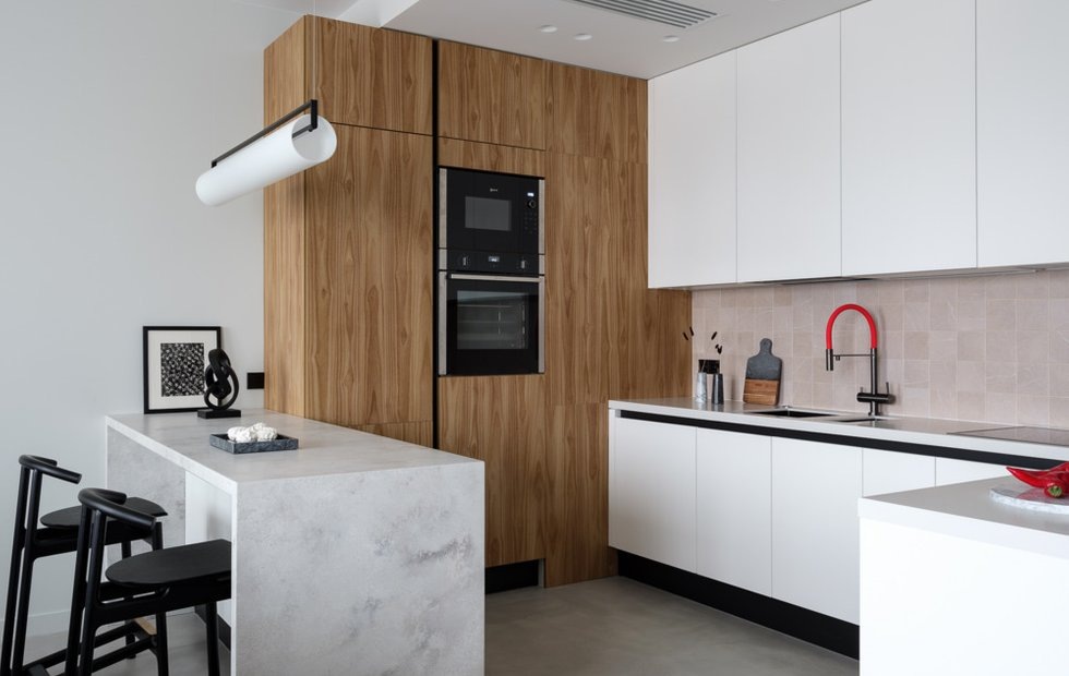 Кухня совмещена с гостиной. Кухонный гарнитур изготовлен на заказ. Мебель выбрали белого оттенка с элементами дерева в колонне. При этом здесь присутствуют разные объемы: кухня — это один объем, в него «врезается» потолок. Другой объем — это часть кухни, которая имеет стеклянное «парящее» основание.