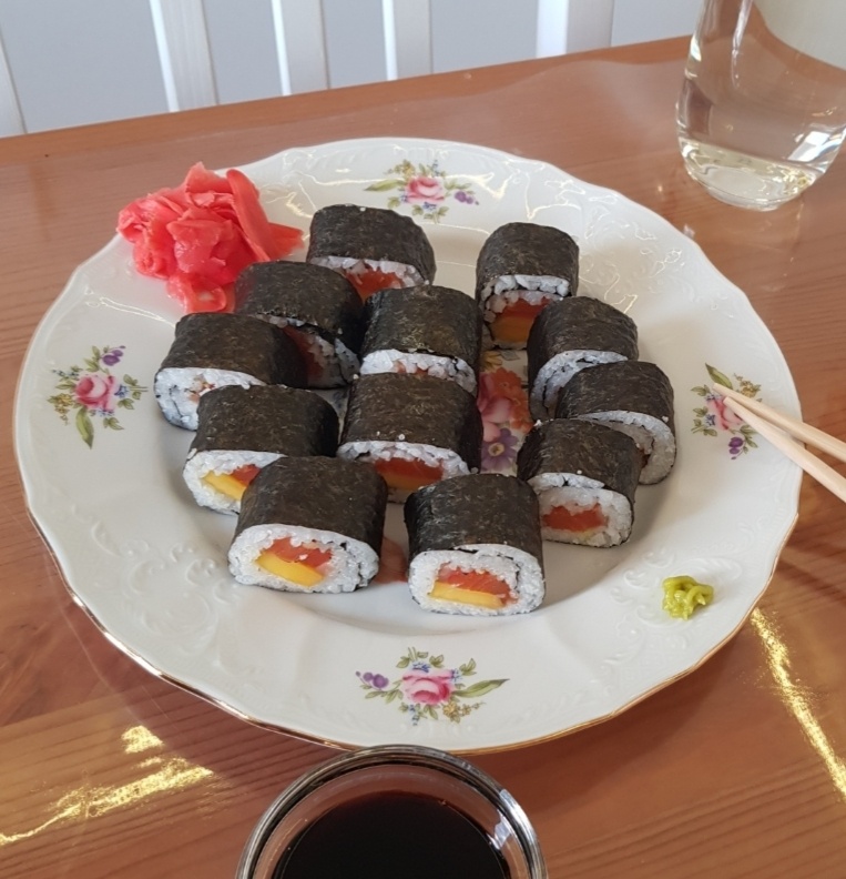 Добрый день, дорогие друзья! Сегодня вашему вниманию я предлагаю рецепт роллов с сёмгой, манго и мягким сыром. Для приготовления нам понадобятся: рис для суши 250 грамм, сёмга 250 грамм, манго 1 штука, творожный сыр 100 грамм, сахар 2 чайные ложки, соль 1 чайная ложка, рисовый уксус 5 чайных ложек, листы нори 3 штуки, маринованный имбирь, васаби, соевый соус и циновка для приготовления суши и роллов. Дополнительно для приготовления воды для смачивания рук нам понадобятся: вода 1/2 стакана, 1 чайная ложка уксуса, 1/5 чайной ложки соли, 1/2 чайной ложки сахара. Приготовление: рис промыть в холодной воде, высыпать в кастрюльку с толстым дном, залить водой в соотношении 1:1, довести до кипения, накрыть крышкой и варить в течение 15 минут. При этом солить рис не нужно, а также не нужно открывать крышку. Через 15 минут рис убрать с огня и, не открывая крышки, дать постоять ему в течение 15 минут. В сотейник налить уксус, добавить соль и сахар, перемешивая, нагреть до полного растворения са