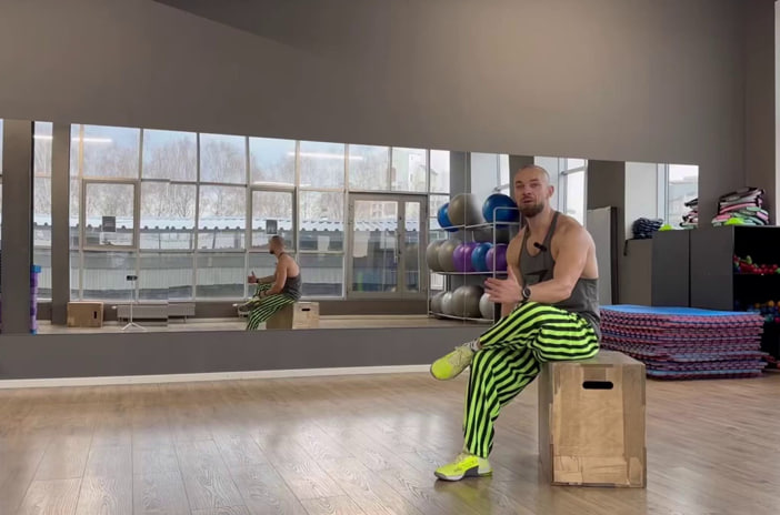 Любой человек садится на скамейку, ящик — неважно. Ставит руки так, как ему кажется хорошо. Чем больше захватил, тем лучше. Ставит ноги прямые, чтобы якобы ногами не помогать.